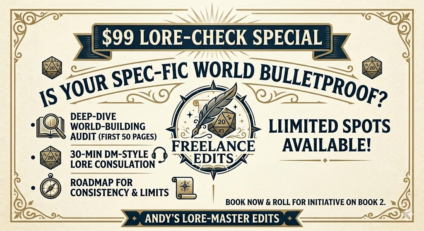 Book a World-Building Audit now (full package!), and get 10% off your future Developmental Edit for this manuscript.